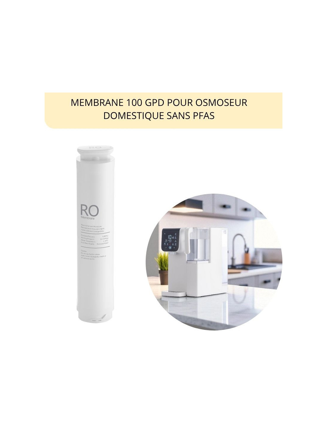 Offrez-vous une eau purifiée sans PFAS ! Cette membrane 100 GPD pour osmoseur domestique retient chlore, bactéries et contaminants. Son changement, guidé par l'écran digital, assure une qualité de l'eau optimale pendant 14 à 18 mois selon la qualité de votre eau.